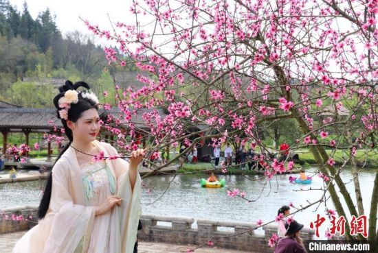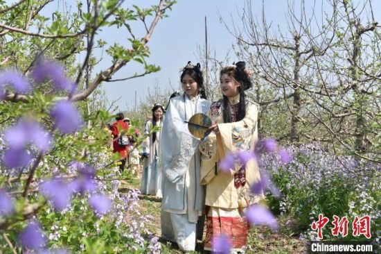 资料图:游客身穿汉服踏青赏花。高雷 摄