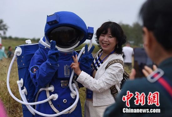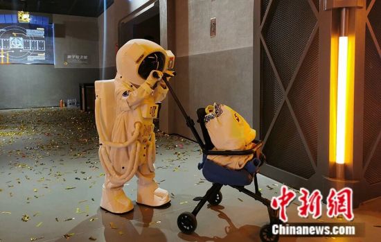 2025年10月,山东海阳,游客与身穿“宇航服”的人偶合影。王娇妮 摄
