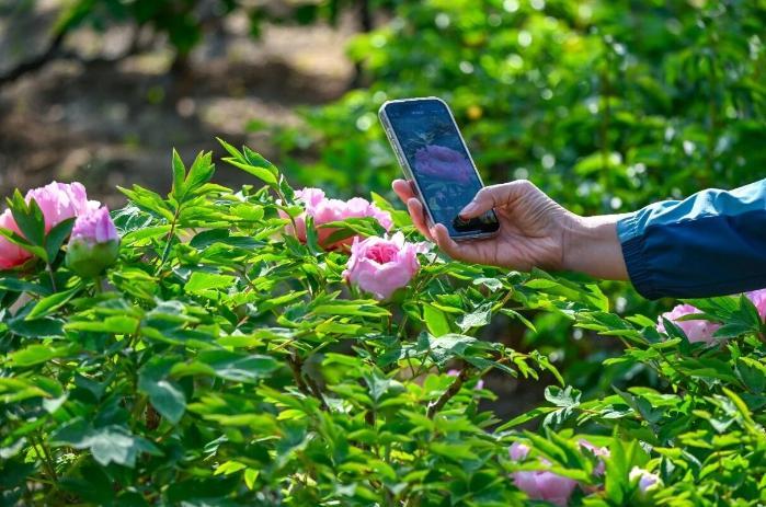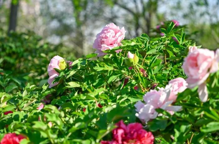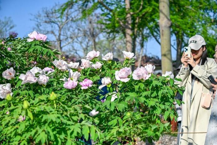 百花公园牡丹顺地势自然铺展,少了几分规整,多了几分天然野趣,粉白凝脂、紫霞晕染,清润华贵,花香怡人。