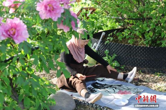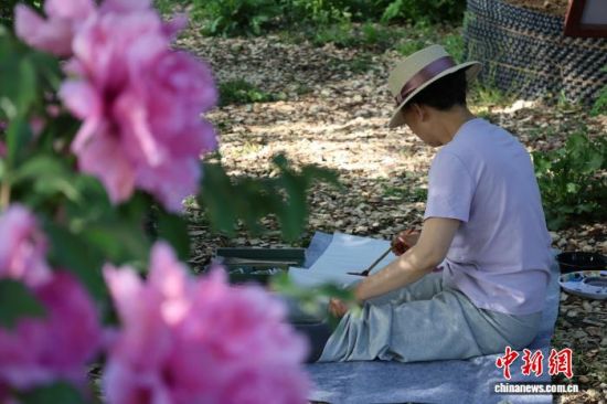 4月10日,位于山东菏泽鲁西新区的菏泽牡丹园,各色牡丹争奇斗艳,吸引画师写生。中新社记者 李明芮 摄