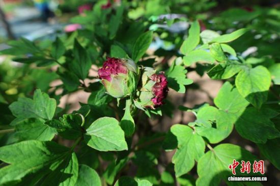 4月10日,位于山东菏泽鲁西新区的菏泽牡丹园,并蒂牡丹含苞待放。中新社记者 祁建月 摄