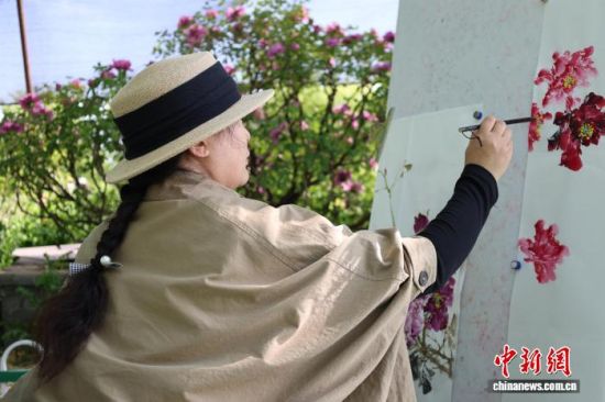 4月10日,位于山东菏泽鲁西新区的菏泽牡丹园,各色牡丹争奇斗艳,吸引画师写生。中新社记者 祁建月 摄