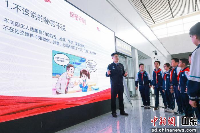 中新网山东新闻4月13日电(梁犇 沈泰)4月13日,在第11个全民国家安全教育日来临之际,济南出入境边防检查站联合济南市国家保密局、山东省公安厅机场公安局、济南机场,在济南机场开展“国门一线共上国家安全教育课”主题宣传活动,山东师范大学第二附属中学50名师生代表走进国门一线接受沉浸式安全教育。