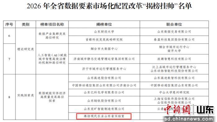 紧随其后,潍坊峡山区在省级重大改革任务中再次取得“零的突破”。4月14日公布的《2026年全省数据要素市场化配置改革“揭榜挂帅”名单》显示,潍坊峡山区重点支持的潍坊现代农业山东省实验室成功揭榜,入选“数据赋能实体经济高质量发展路径探索项目”。该实验室成为潍坊市此榜单中唯一的入选单位,也是全省该领域仅有的6个获批项目之一。此次入选意味着潍坊峡山区正式承担起省级数据要素改革前沿课题的探索重任。