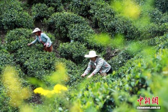 4月17日,湖北省宜昌市夷陵区太平溪镇,茶农在生态茶园里采摘“谷雨茶”。 李重庆 摄