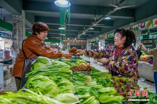 4月14日,湖北省宜昌市一菜市场内,市民正在购买香椿。 陈涛 摄