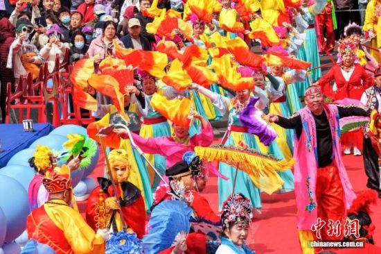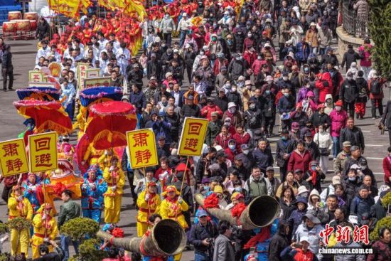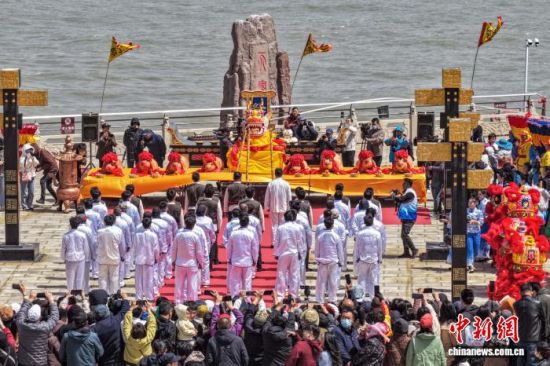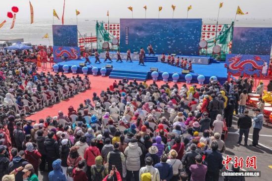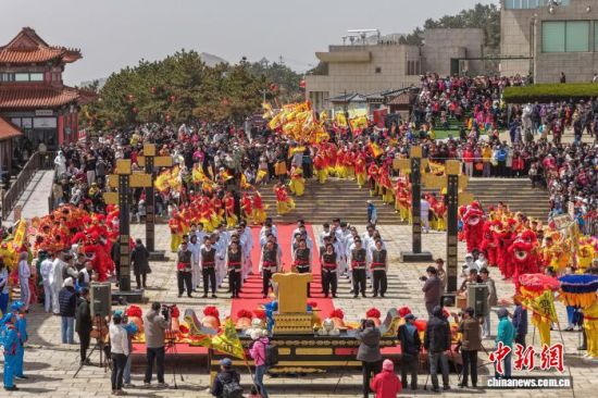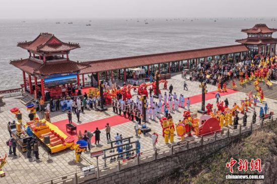4月20日,谷雨时节,山东荣成成山头景区举办祭海仪式,呈现渔民祈福的民俗盛况。谷雨祭海是山东胶东沿海地区传统民俗,当地民众以此祈愿出海平安、渔业丰收。(无人机照片) 李信君 摄