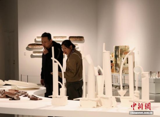 观众在展览现场欣赏陶瓷艺术作品。赵晓 摄