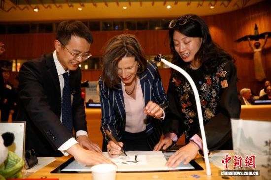 当地时间4月13日,以“翰墨和鸣,华章同赋”为主题的联合国中文日庆祝活动在纽约联合国总部举行。图为联合国副秘书长弗莱明(中)使用京师AI书法屏体验中文书法。中新社记者 廖攀 摄