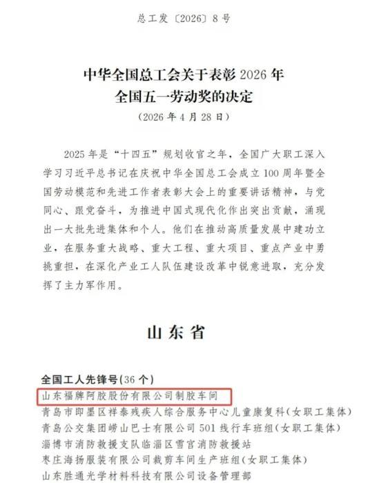中新网山东新闻4月29日电 4月28日,中华全国总工会发布全国五一劳动奖表彰决定,山东福牌阿胶股份有限公司制胶车间荣获“全国工人先锋号”称号。这一国家级荣誉,是对这支扎根一线、坚守匠心、勇于创新、无私奉献的产业工人队伍的最高褒奖,更是福牌阿胶七十余载深耕中医药产业、推动非遗传承和创新发展的生动缩影。