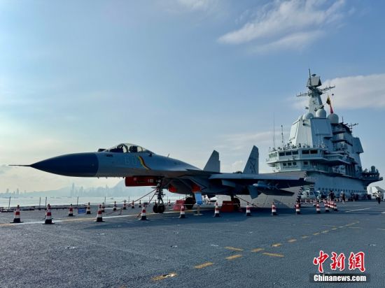 7月4日,山东舰举行开放参观活动。据了解,由中国人民解放军海军航空母舰山东舰,导弹驱逐舰延安舰、湛江舰及导弹护卫舰运城舰组成的航母编队抵达香港,开启为期5天的访问活动。图为一架歼-15舰载机停放在起飞位,向公众开放参观。图为香港制服团体成员与一位山东舰士兵、歼-15T舰载机合影。