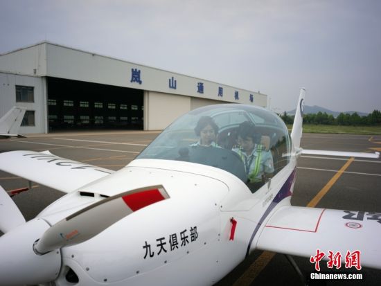 图为5月22日,日照市岚山区的岚山通用机场内,飞行教练韩宝照(左)在机舱内示范操作。中新社记者 盛佳鹏 摄