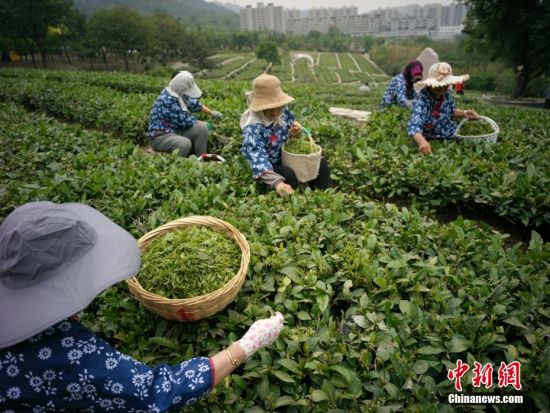 图为5月22日,日照市岚山区安东卫街道北门外1966青葱茶园里,采茶工们采摘茶芽。1966年春,当时的安岚区北门外大队被选为南茶引种的两个试点村之一,共种植了8.7亩茶树,最终成活率达57%,南茶北引试种在这里成功,北门外1966也因此具有了特殊的纪念寓意。中新社记者 盛佳鹏 摄